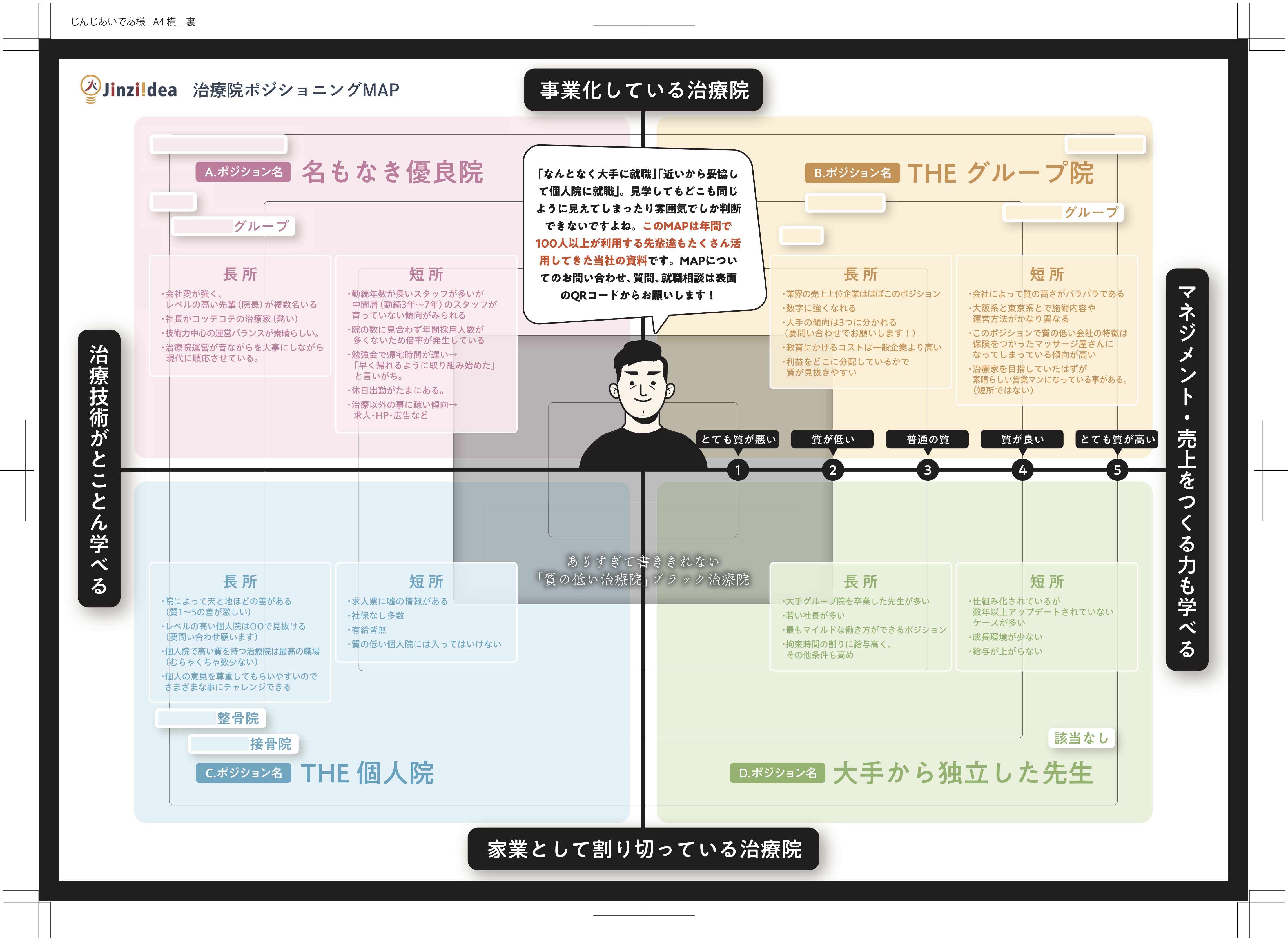 この治療院ポジショニングマップは業界を10年以上みてきた経験からできた「自分に合った治療院探し」の道標です。